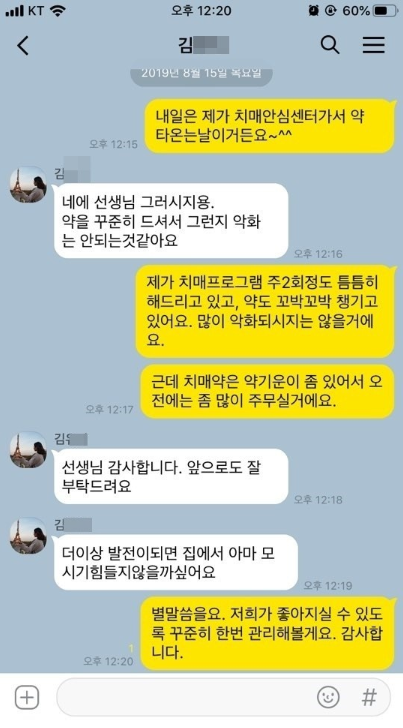 아래 사진은 실제로 복약이 제대로 이뤄지면서 인지 상태가 악화되는 것을 막고 꾸준히 관리를 받아 만족스럽다고 말씀해 주신 보호자님의 연락이었습니다.